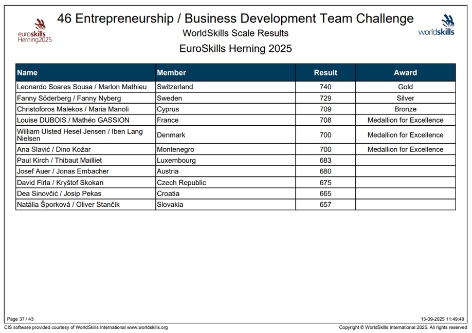 Tabuľka sumárnych výsledkov hodnotenia súťaže v odbore podnikanie EuroSkills 2025 Herning Dánsko